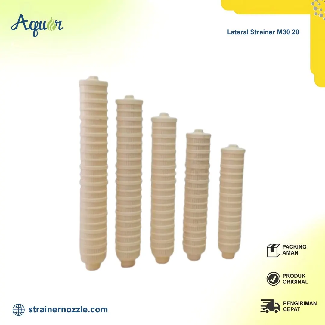 Lateral Strainer M30 20 adalah komponen filtrasi air berbentuk lateral yang berfungsi menyaring partikel mikro dengan presisi tinggi. Produk ini tidak hanya menyaring, tetapi juga memastikan distribusi air merata di dalam tangki filter sehingga media filtrasi bekerja maksimal. Terbuat dari material premium tahan korosi, strainer ini cocok untuk sistem water treatment skala industri maupun komersial.